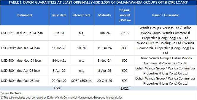DWCM also provides guarantees on originally USD 2.0bn of Wanda Group’s offshore loans (see table 1), a significant amount compared to DWCM’s own USD 1.4bn offshore debt as of end-August, comprising three USD bond tranches.