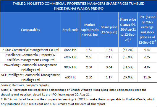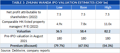 If the share price performances of peers are any guide, Zhuhai Wanda’s current market valuation should be only CNY 36.5bn-CNY 82.2bn, or 50% to 80% lower than the August 2021 CNY 180bn pre-IPO valuation cited in the listing prospectus (see table 2 for trading multiples of Hong Kong listed mainland Chinese commercial property managers and table 3 for Debtwire’s estimates for Zhuhai Wanda IPO valuation).
