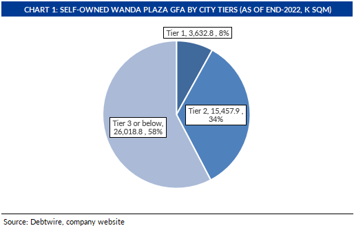 - DWCM’s corporate website shows that it owned and or operated 473 Wanda Plaza-branded shopping malls with total GFA of 65.6m sqm as of end-2022 (latest publicly available figure). Of the 473, it owned and operated 310 with total GFA of 45.1m sqm while it only operated the remaining 163 third-party owned malls. Tier-3 or lower, tier-2 and tier-1 cities accounted for 58%, 34% and 8%, respectively, of the company’s total owned and operated GFA as of end-2022 (see chart 1 below).