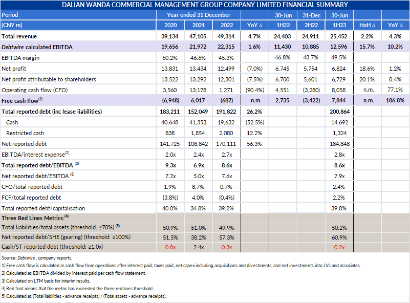 DWCM has CNY 8.1bn pro forma cash (adjusted only for financing) and is expected to generate CNY 15.7bn free cash flow in the twelve months through June 2024 from property management revenues and rental income from its mature portfolio of 473 operating Wanda Plaza shopping malls, per Debtwire estimates (see the 2nd bullet point for pro forma adjustments). That liquidity is more than enough to cover the shopping-mall owner and operator’s CNY 5.2bn hard debt maturities through June next year, comprising USD 600m, 7.25% due-29 January 2024s and CNY 790m onshore bonds across three tranches due between November 2023 and April 2024.