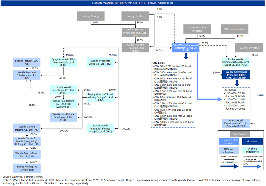Group Chairman Wang Jianlin controls an effective 53.3% stake in DWCM, including a 44.3% held by his family’s wholly owned Wanda Group (see bottom of this report for a simplified corporate structure of Wanda Group).