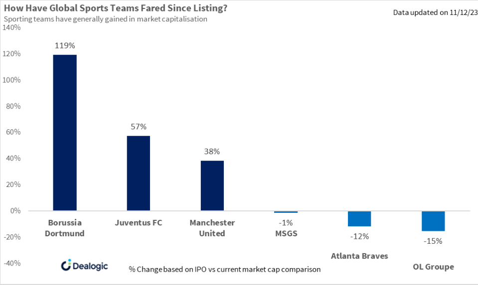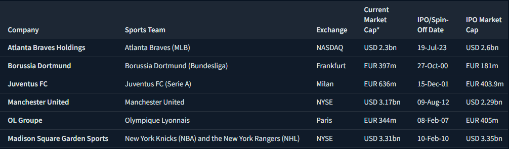 Among listed sports peers, Madison Square Garden Sports commands the highest valuation at USD 3.31bn, but its value has eroded from its listing in 2010.